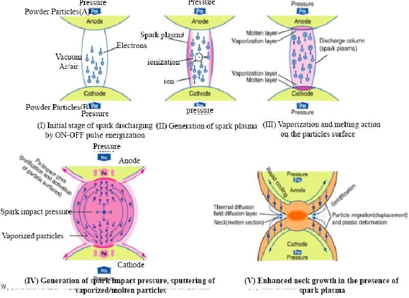 由于電流通過(guò)顆粒而引起的焦耳加熱有助于在機(jī)械壓力下焊接顆粒。導(dǎo)電顆粒表面上產(chǎn)生的強(qiáng)烈焦耳加熱效應(yīng)通常會(huì)達(dá)到沸點(diǎn),從而導(dǎo)致粉末表面的局部蒸發(fā)或清潔。