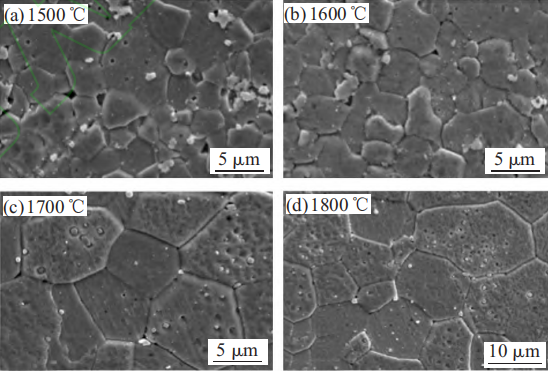從圖中可以明顯看到,燒結(jié)溫度為1500℃時,平均晶粒大小為3.34um,此時致密度較低,晶粒之間存在明顯的空隙,燒結(jié)效果并不理想;當(dāng)燒結(jié)溫度為1600℃時,晶粒大小為3.74um,可以看出合金的晶粒大小并沒有明顯長大,但是致密性卻有明顯的改善;當(dāng)燒結(jié)溫度為1700℃、1800℃時,晶粒明顯長大,約9.5um。