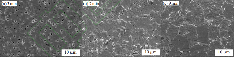 從上圖(a)可以看出,保溫時間較短時,粉末坯存在明顯的燒結(jié)頸,隨著保溫時間的增加,燒結(jié)頸消失,孔隙閉合,致密度有明顯增加,并且此時晶粒尺寸沒有明顯長大,如圖(b),之后再進行保溫,可以看出晶粒明顯長大如圖(c)。