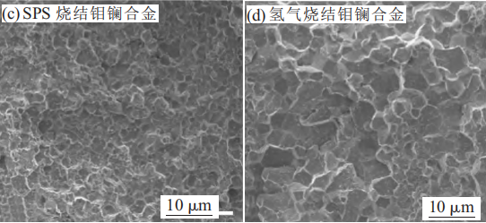 通過對SPS燒結(jié)(溫度1600℃、保溫7min)及氫氣保護燒結(jié)(1800℃,保溫6h)合金進行抗拉強度和抗壓強度測試,發(fā)現(xiàn)采用SPS燒結(jié)的鉬鑭合金抗拉強度以及抗壓強度分別提升765MPa、2307MPa。對兩種試樣的斷口分析發(fā)現(xiàn)SPS燒結(jié)的合金晶粒大小更加均勻細小。